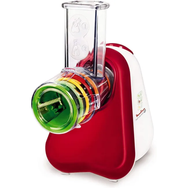 Le Fresh Express de Moulinex est équipé de plusieurs accessoires interchangeables qui permettent de râper fin, râper gros, trancher et même gratter des aliments comme le fromage ou le chocolat. Son moteur puissant garantit des résultats rapides et efficaces, tandis que son design compact et ergonomique facilite le rangement et l'utilisation. Les cônes de couleur différente facilitent la reconnaissance et l'utilisation correcte de chaque fonction. De plus, toutes les pièces amovibles sont compatibles avec le lave-vaisselle, ce qui simplifie grandement le nettoyage.