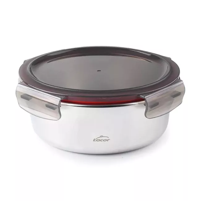 Le conteneur rond Ecoinox 1,5 L de Lacor est conçu en inox 18/10 avec un couvercle hermétique à clips. Robuste, étanche et compatible micro-ondes, il est parfait pour conserver, transporter ou réchauffer vos préparations de manière sûre et pratique.